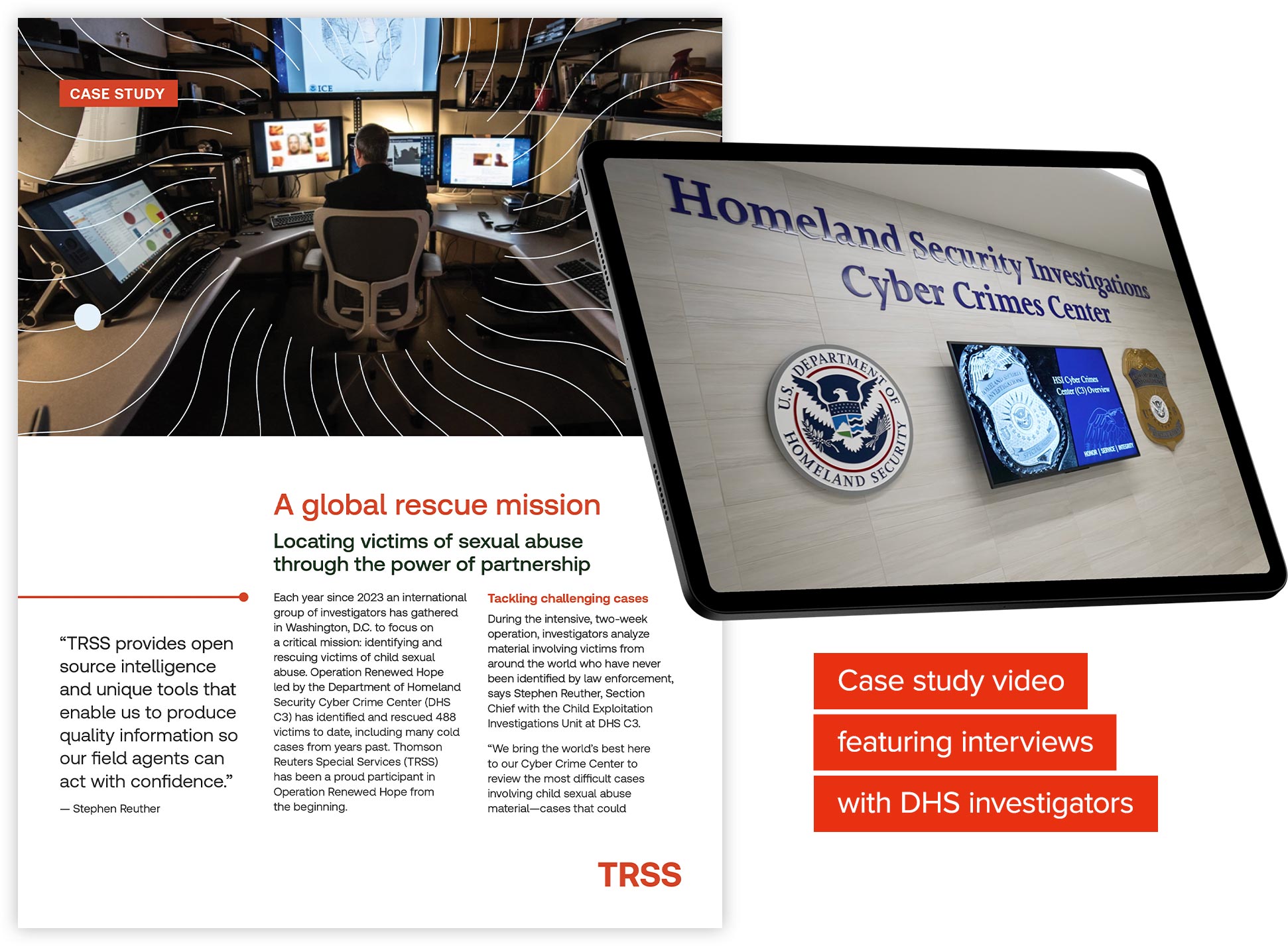 Our client Thomson Reuters partners with law enforcement across the U.S. and internationally to help fight child exploitation and abuse. We created a series of case studies highlighting how the company’s software and services play a key role in helping rescue victims and bring perpetrators to justice. The impactful campaign included print materials and a video featuring interviews with Department of Homeland Security Cyber Crimes Center investigators and TRSS professionals.